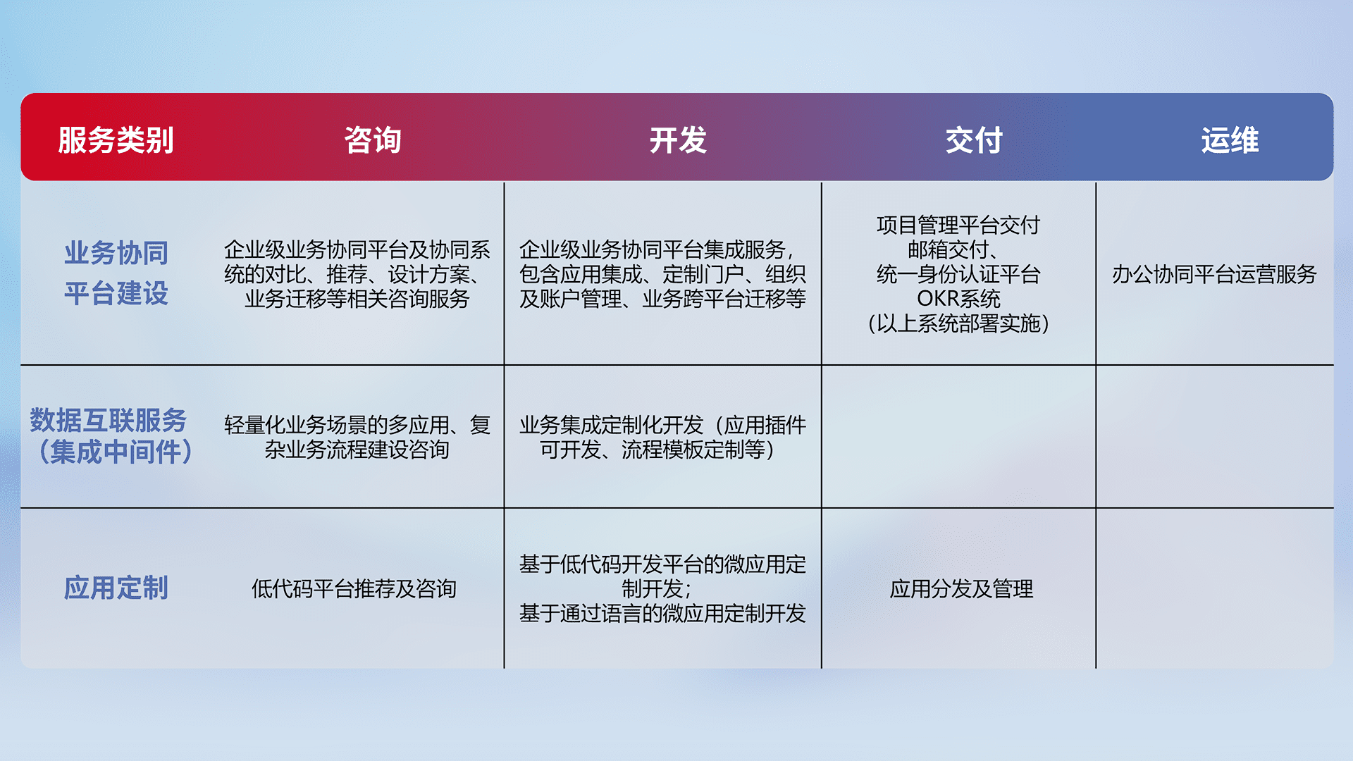 针对钉钉、、企微、、、、IDaas等平台级产品提供产品的规划、、、、方案、、交付、、定制化开发等服务,,实现如统一协同办公、、、、智能客户服务、、、、混合会议管理、、、智能数据查询、、、等业务场景,,,实现数字化转型。。
